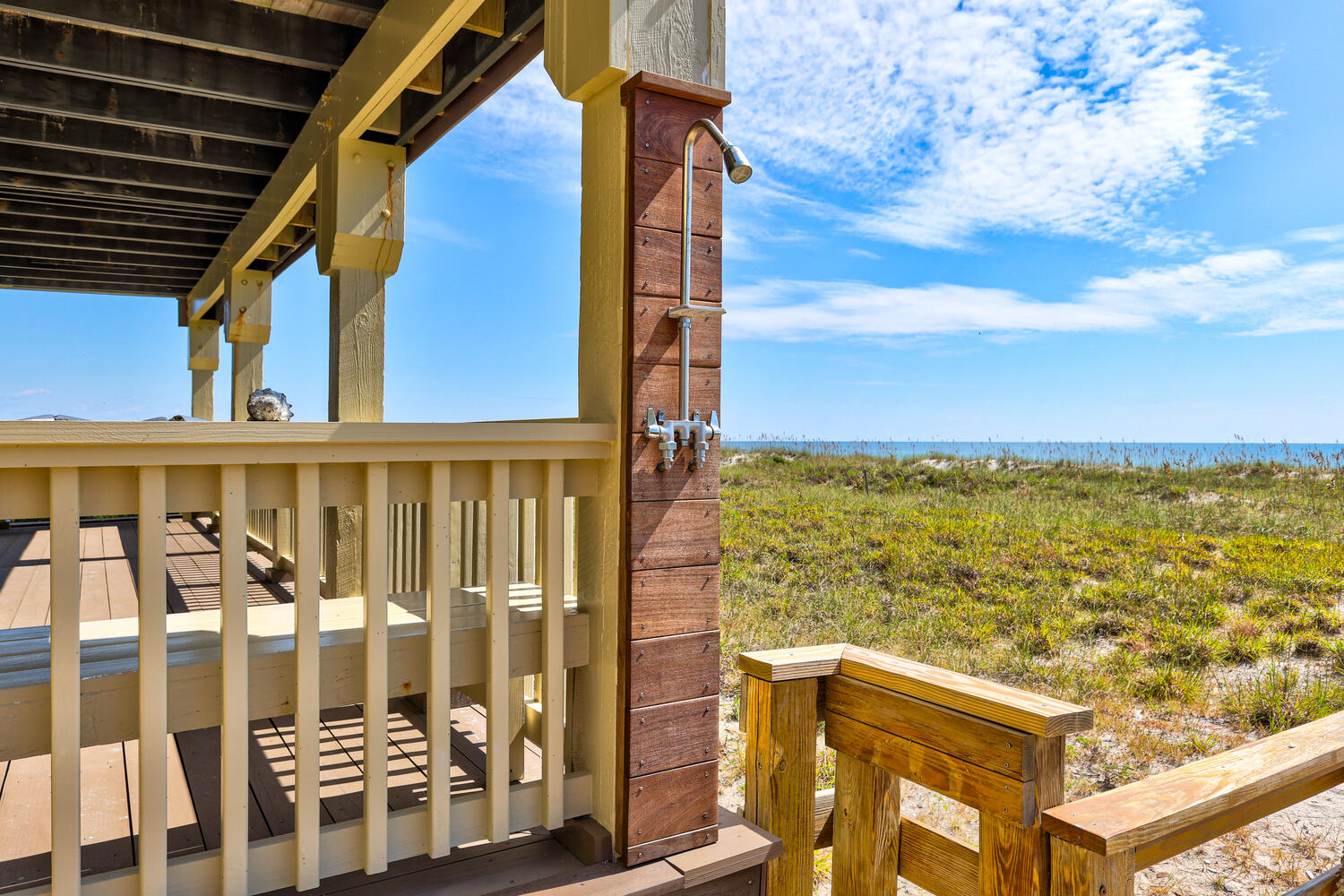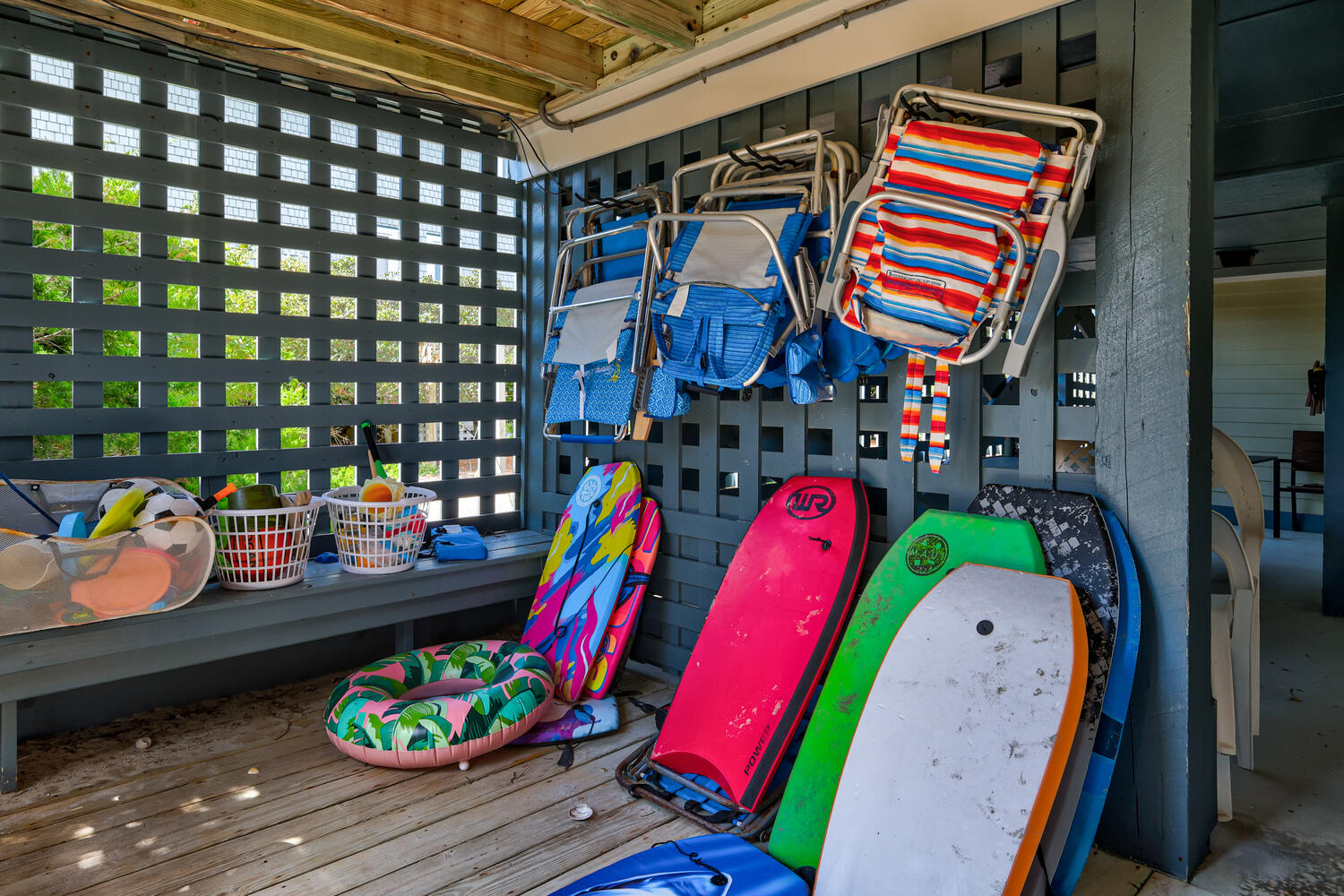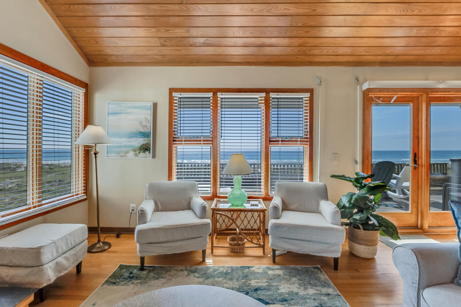 Outside, you’ll find spacious decks, a ping pong table, covered parking, an outdoor dining table (perfect for sandy kids), an outdoor shower, rocking chairs and a private walkway to the beach.