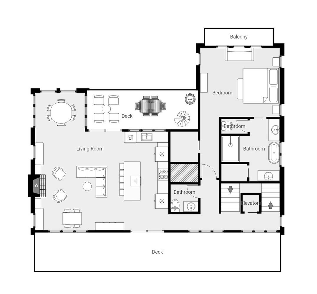 This floor has a deck with a grill, al fresco dining and covered seating area. The beautiful master suite with a king bed and private bath is also on this floor, along with a powder room.
