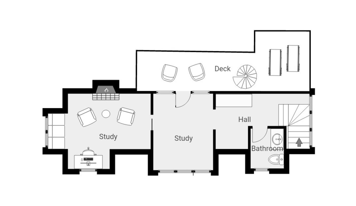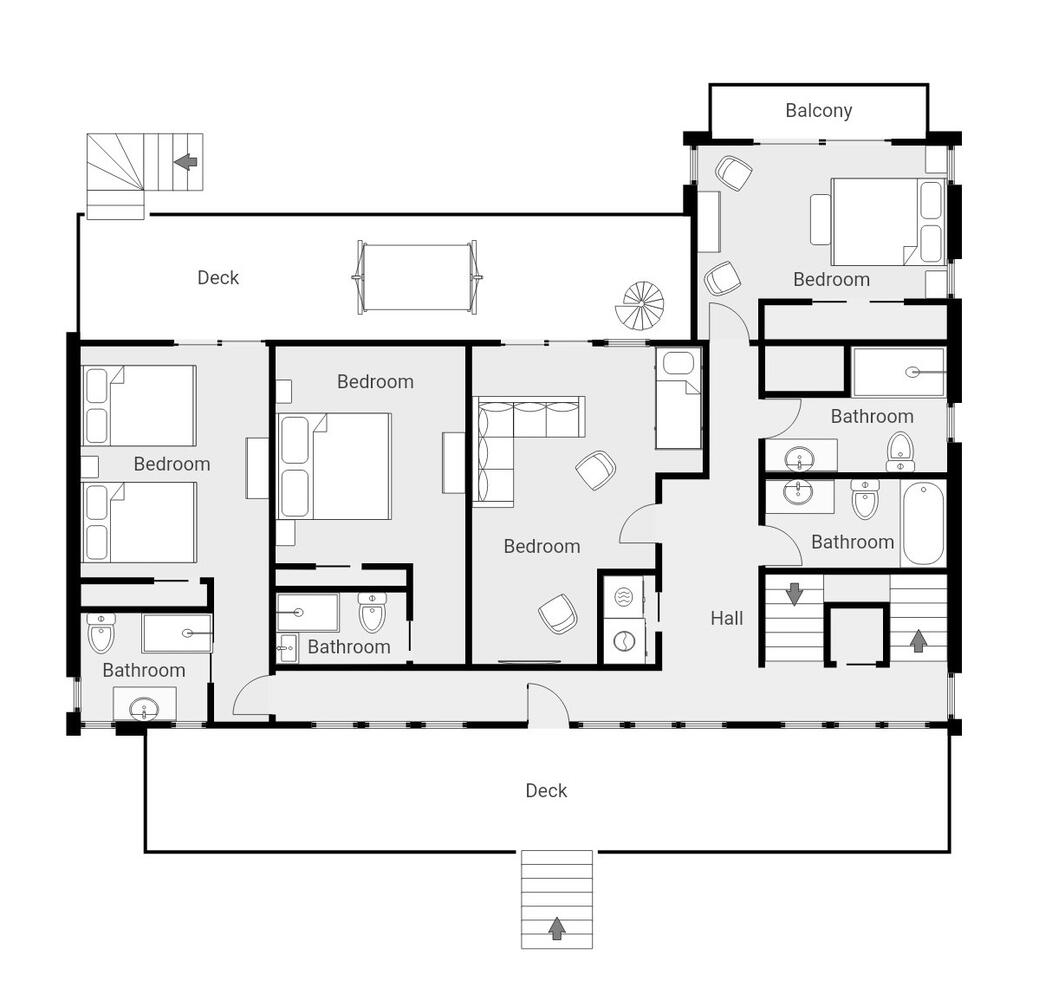 The fourth floor has additional living spaces, including a quiet space with a desk and open areas with views in both directions. The large deck has both covered areas with comfy seating and open areas with lounge chairs for soaking up the sun.